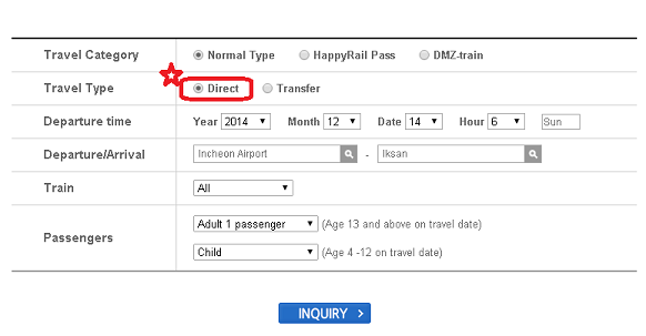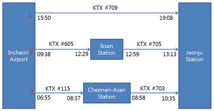 For the 2nd or 3rd options, you should buy two direct (travel type) tickets from Korail Page separately. (Please check the train number and the departure time for each purchase carefully.) At the moment, the Korail page does not provide a correct transfer option from ICN to Jeonju. Therefore, in all cases, you should only select a direct (travel type) ticket in the ticket website. |